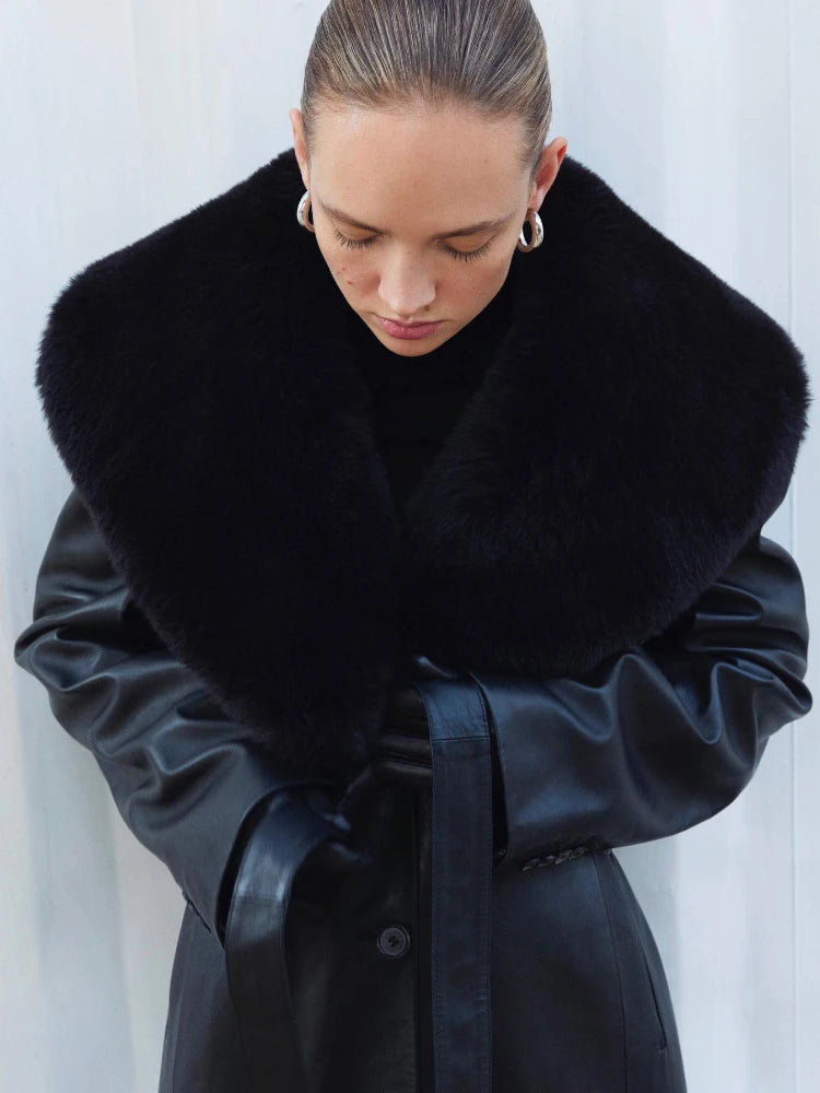 Extra-langer schwarzer Leder Trenchcoat – mit Kunstfell, Gürtel und Slim Fit - black / S / Kunstleder